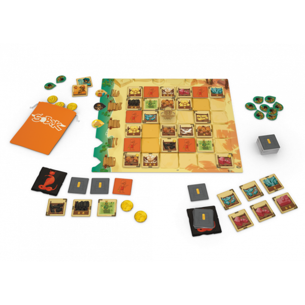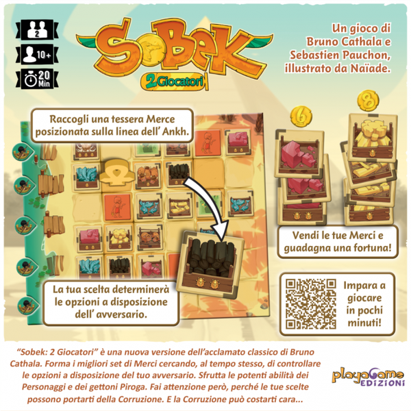 È in corso la costruzione di un tempio dedicato a Sobek. Nei pressi del sito, lungo il Nilo, è sorto un enorme mercato, rifornito dal continuo andirivieni di feluche e piroghe. La tua Gilda dei Mercanti e quella del tuo avversario sono determinate a sfruttare questa incredibile opportunità. Il dio Sobek potrebbe far pendere l’ago della bilancia offrendo i suoi favori al mercante meno corrotto.