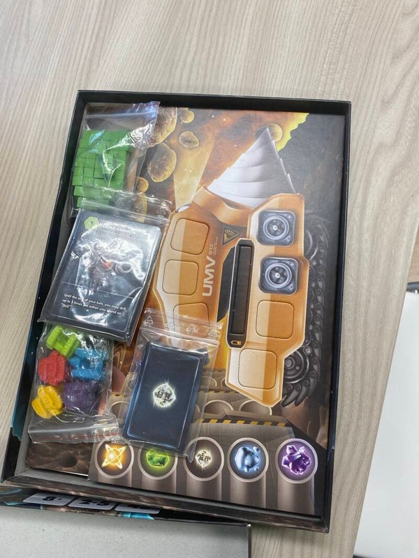 Contenuto della scatola: 1 tabellone a doppia faccia, 18 carte contratto, 18 tessere starbuck, 16 tessere equipaggiamento, 5 tessere stiva, 5 tabelloni giocatore, 10 carte tecnologie aliena, 5 miniature UMV di plastica, 129 gettoni risorsa, 40 cubetti di legno, il regolamento.