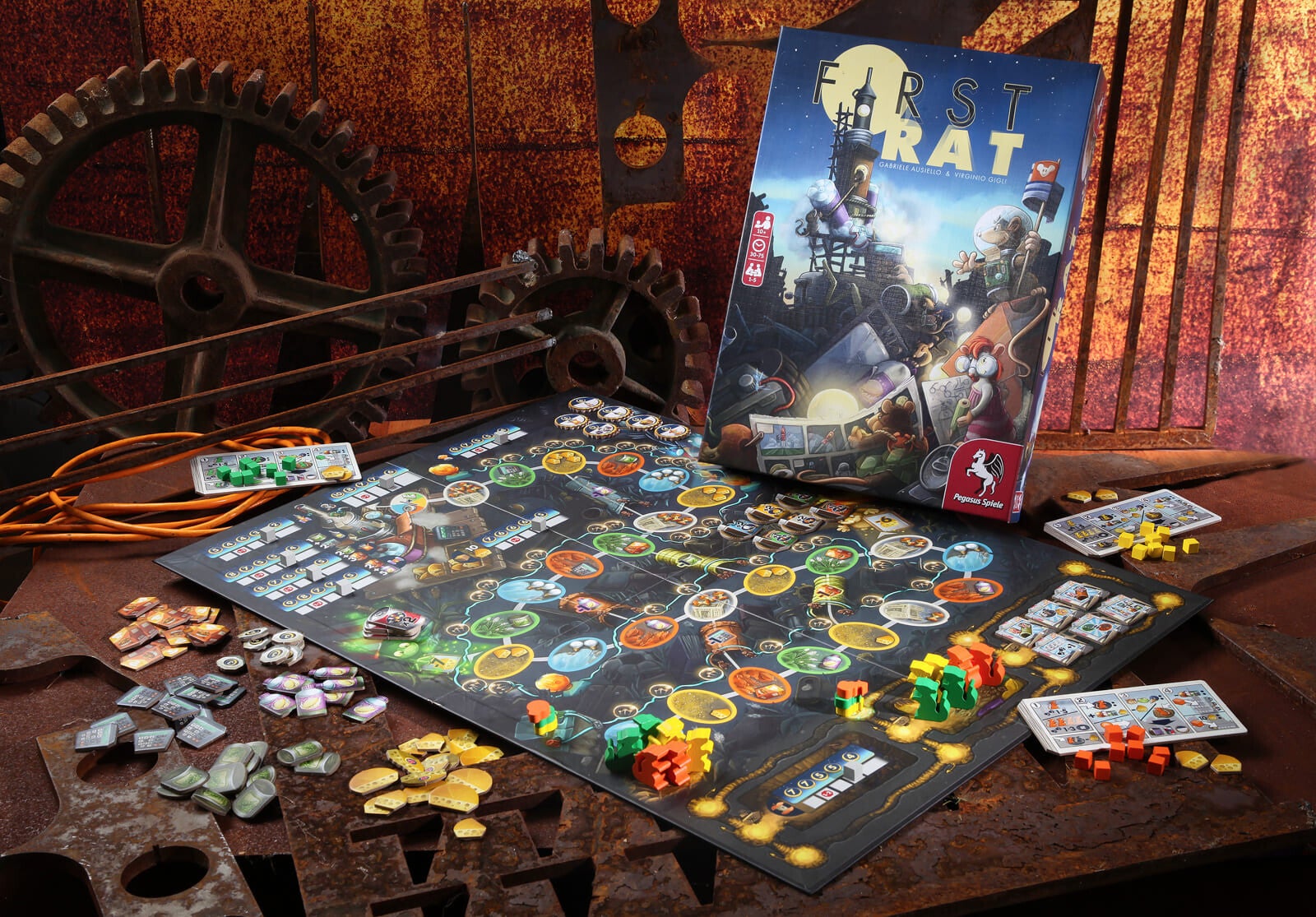First Rat è un gioco base per un massimo di cinque giocatori, che può essere giocato anche da soli. Numerose strategie, abilità speciali e una configurazione variabile creano nuove emozioni per ogni gioco. Ad ogni turno, i giocatori devono decidere se vogliono spostare uno dei loro ratti fino a cinque spazi o se vogliono invece spostare più ratti fino a tre spazi – cosa possibile solo se i ratti terminano il loro movimento su spazi dello stesso colore. E se in quello spazio ci sono già dei topi, costa anche un formaggio per topo! Muovendosi attraverso la discarica, i giocatori raccolgono risorse, acquistano (o rubano) oggetti utili, costruiscono parti del razzo o addestrano i loro Rattronaut, per raccogliere quanti più Punti Vittoria possibile. Chi sarà il Primo Topo?