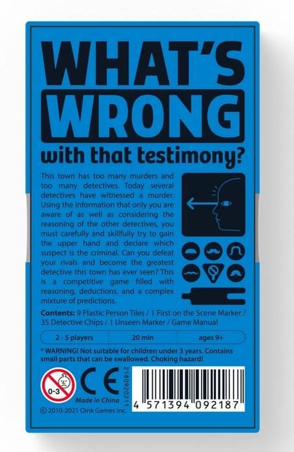 Questa città ha troppi omicidi e troppi detective. Oggi diversi investigatori hanno assistito a un omicidio. Usando le informazioni di cui solo tu sei a conoscenza e considerando il ragionamento degli altri investigatori, devi cercare con attenzione e abilità di prendere il sopravvento e dichiarare quale sospettato è il criminale. Riuscirai a sconfiggere i tuoi rivali e diventare il più grande detective che questa città abbia mai visto? Questo è un gioco competitivo pieno di ragionamenti, deduzioni e una complessa miscela di previsioni. Questa è una nuova versione di uno dei primi lavori di Oink Games con regole e componenti aggiornati. È fantastico anche per i giocatori della versione precedente!