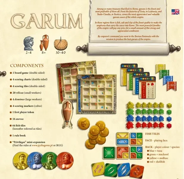 Garum, originario del Portogallo e della Spagna di oggi, era molto apprezzato a Roma e ora ha ispirato un versatile gioco da tavolo di strategia per tutta la famiglia, dagli 8 anni in su, che coinvolge da 2 a 4 giocatori. Garum è un gioco di posa di tessere, che si gioca in circa 30 minuti, è indipendente dalla lingua e presenta una rigiocabilità infinita, grazie al suo sistema di gioco, che garantisce che non ci siano due giochi uguali.