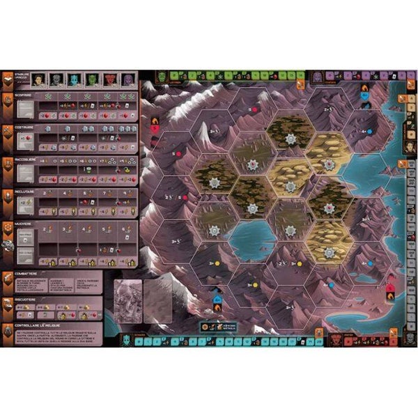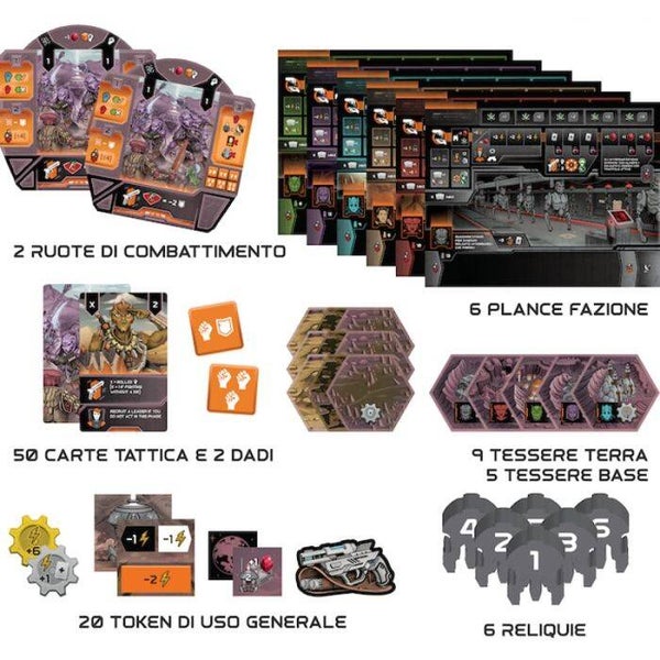 Circadians: Caos e Ordine è un gioco di controllo territorio competitivo e di schermaglie con Fazioni altamente asimmetriche. Ogni Fazione ha Leader e Attributi unici che possono essere potenziati durante il gioco; ha anche Edifici unici da costruire e un obiettivo personale per la vittoria, che va in aggiunta all’obiettivo globale di controllare tutte le Reliquie rimanenti sulla Mappa. Nel corso di un massimo di 6 Round, i giocatori faranno ricerche scientifiche, costruiranno edifici e raccoglieranno risorse. I giocatori recluteranno e muoveranno anche Unità, il tutto nel tentativo di catturare le antiche Reliquie, controllare le Regioni vitali per la loro strategia e guadagnare abbastanza Fama per essere incoronati vincitori di Caos e Ordine. Caratteristiche Principali: 6 fazioni asimmetriche, ognuna con i propri leader, attributi e condizioni di vittoria unici. Un sistema di combattimento sfaccettato che offre ai giocatori un buon margine di manovra, senza che tutte le battaglie siano completamente deterministiche. Meccanismi strategici tipici degli eurogame al centro, con un sistema innovativo di selezione delle azioni e gestione delle risorse interattivo e rigoroso. Una buonissima variabilità di gioco, grazie all’impostazione semi-modulare della mappa, le 6 fazioni uniche e all’alto livello di interazione tra i giocatori. Scalabilità della mappa ad ogni numero di giocatori (da 2-5). Un inserto funzionale e le 6 Scatole Fazione semplificano il setup e il riporre tutto nella scatola. Elementi di Gioco: Insert custom Tabellone 2 Route di Combattimento 6 Plance Fazione 50 Carte Tattica 2 Dadi Custom 14 Tessere Esagonali 20 Gettoni Vari 6 Reliquie in legno 50 Energia, 30 Gemme e 10 Montagne in legno 111 Gettoni Specifici di Fazione 6 Scatole Fazione 19 Carte Leader e 3 Carte Ryh-Zu 19 Carte Attributo e 5 Carte Intel 54 Edifici in legno 6 Segnalini Fama e 30 Segnalini Ricerca in legno 22 Standee 120 Soldati e 1 Navicella in legno Dimensioni Carte: 72 carte 54x86mm 24 carte 43x67mm
