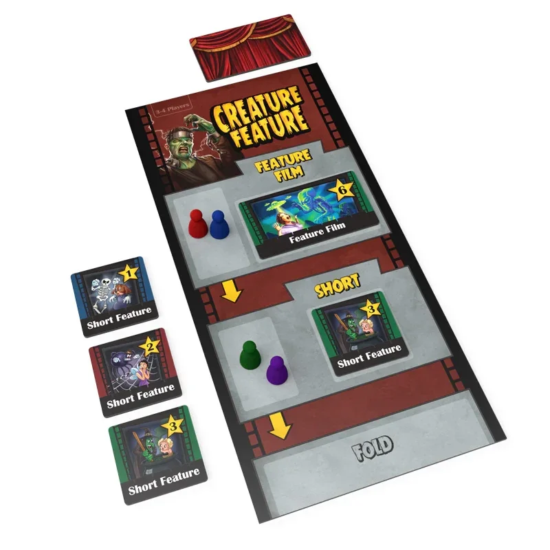 Sei un agente nell'età d'oro dei film di mostri! Gli attori che rappresenti sono specializzati in particolari ruoli mostruosi e tu devi competere per ottenere loro i migliori possibili. Le tattiche e il bluff in stile poker ti porteranno lontano: imparerai quando restare fermo e andare allo showdown o tirarsi indietro e accettare un ruolo minore in un breve film. È meglio assumere le tue grandi star adesso o trattenerle per competere per film più redditizi? Con un po' di fortuna, abilità e faccia tosta potresti ridacchiare maliziosamente per la tua vittoria in Creature Feature! Regolamento Conteggio giocatori 3-6 Tempo di gioco 30-60 minuti Fascia d'età 13+ Componenti 94 carte, 1 tabellone, 6 tappetini, 12 pedine, 19 gettoni