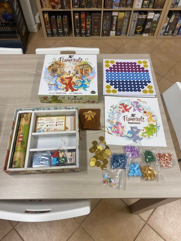In Flamecraft i giocatori competono per diventare il Custode della Fiamma più famoso e di successo in città! Fate crescere la vostra Reputazione visitando i Negozi per collocare Draghi Artigiani, lanciare Incantesimi e portare a termine gli obiettivi segreti dei vostri Draghi Eleganti che vi daranno punti Reputazione aggiuntivi al termine della partita. Durante il turno i giocatori devono muoversi in un nuovo Negozio, decidendo se raccogliere Merci o lanciare un Incantesimo: pagando le risorse richieste dalla carta incantesimo avrete modo di ottenere punti Reputazione e attivare nuovamente tutti i Draghi presenti all’interno del negozio. La partita continua finché il mazzo Drago Artigiano o il mazzo Incantesimo non si esaurisce. Alla fine della partita, il giocatore in vantaggio sul tracciato Reputazione vince!