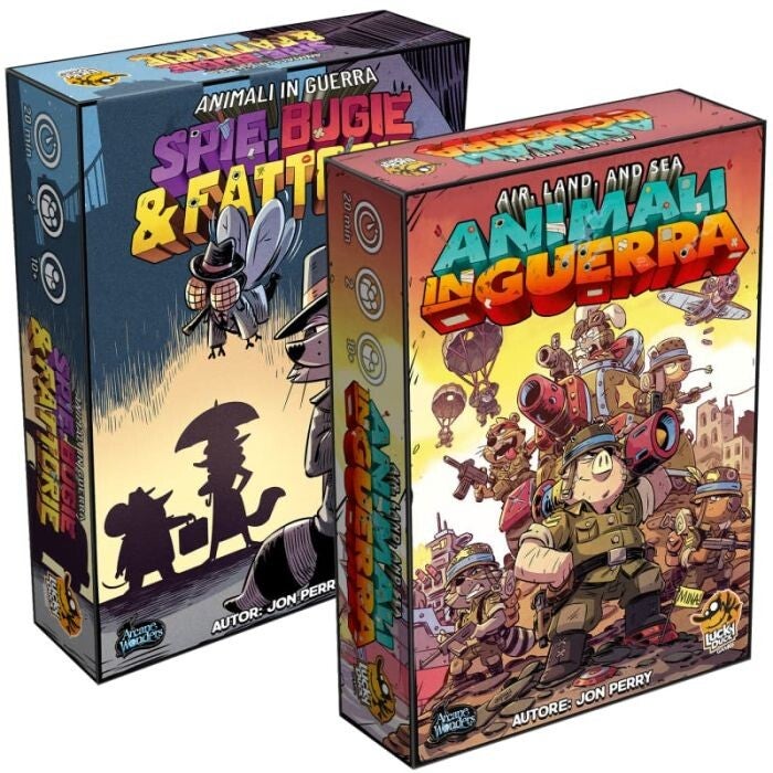 La Guerra Infuria! A molta distanza dalle prime linee, si combatte un tipo diverso di guerra. Dietro porte chiuse, nelle sale di fabbriche e manovrando nell’ombra, soltanto un grande stratega potrà ottenere la vittoria!!! Animali in Guerra Spie Bugie e Fattorie è un set indipendente del gioco di carte Animali in Guerra. Potete giocarlo autonomamente o combinarlo con Air Land & Sea per nuove modalità di gioco e per la versione fino a quattro giocatori a squadre. Datevi battaglia in nuovi intriganti scenari di guerra, con nuove carte e capacità speciali, chi riuscirà a vincere la guerra stavolta? In qualità di comandante supremo, dovrete schierare le vostre forze su tre possibili teatri di guerra: Spionaggio, Diplomazia, Economia. L’ordine in cui giocherete le vostre carte durante la battaglia sarà fondamentale insieme al modo in cui deciderete di giocarle. Tutte le carte possono essere giocate a faccia in su o a faccia in giù. Giocare una carta a faccia in su attiva la sua Capacità Tattica, ma la carta deve essere giocata nel teatro corrispondente. L’attivazione delle carte, da parte di entrambi gli schieramenti, potrebbe cambiare in un attimo lo svolgimento della Battaglia anche sugli scenari adiacenti. Le carte a faccia in giù, sono jolly e possono essere giocate inqualsiasi teatro, ma hanno solo una forza di 2 e non garantiscono Capacità Tattiche. Elementi di Gioco: 1 Regolamento 3 Carte Scenario 18 carte Battaglia 2 Comandante Supremo 14 Carte Punteggio 3 Carte Aiuto 15 segnalini Rifornimento