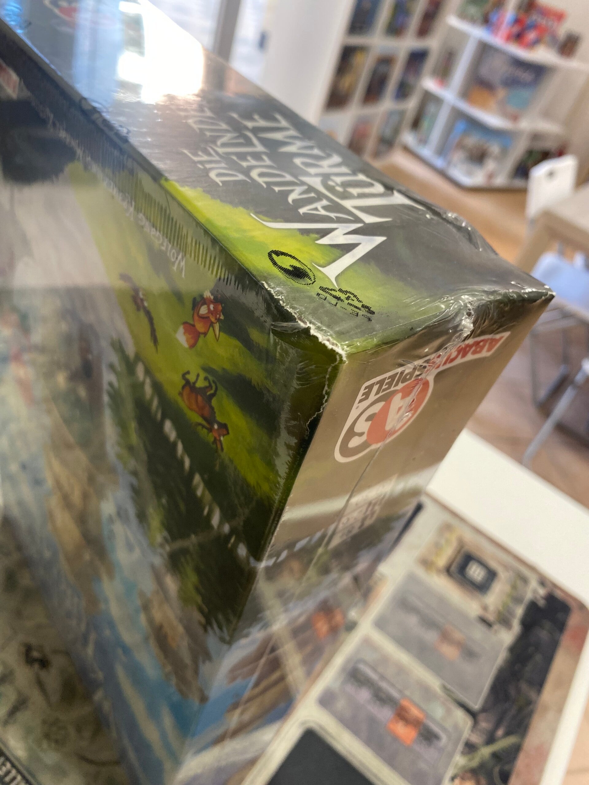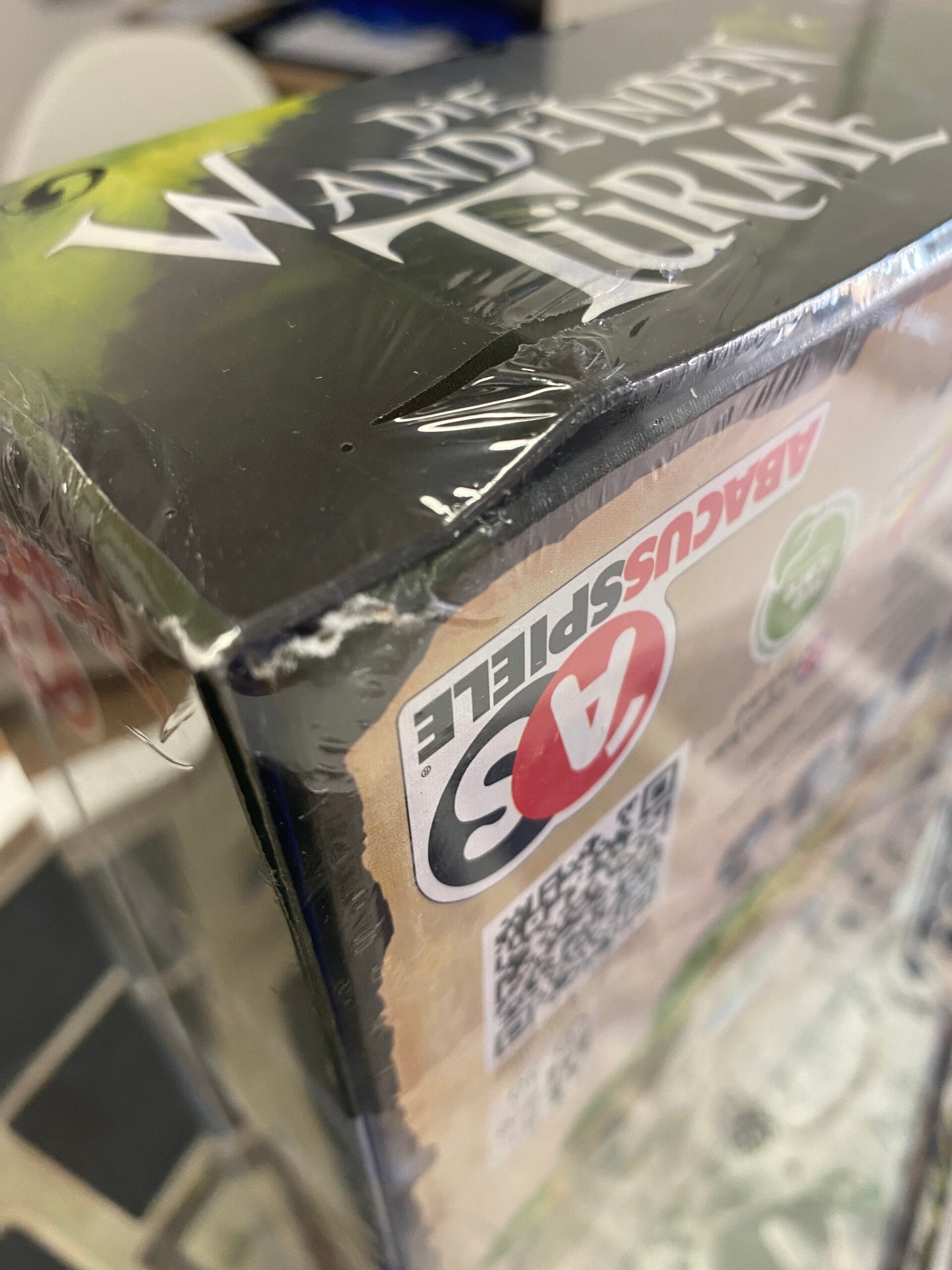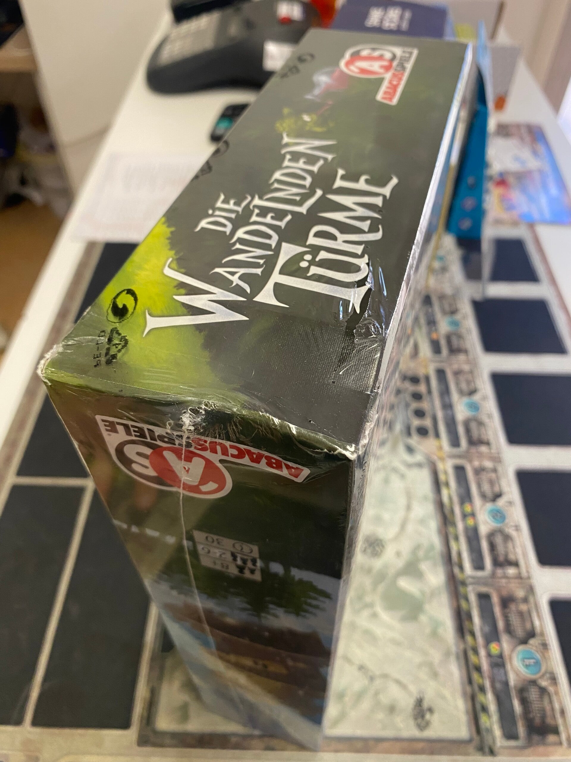 In Die wandelnden Türme ("Le torri erranti"), vuoi portare tutti i tuoi maghi a casa nel castello dei corvi prima di chiunque altro. Per preparare il gioco, posiziona le tessere del tabellone di gioco in un cerchio, il castello del corvo sul suo spazio iniziale e le nove torri in senso orario dal castello; cinque torri hanno uno scudo di corvo su di esse. Distribuisci i maghi dei giocatori - 3-6 in base al conteggio dei giocatori - sulle torri e distribuisci a ogni giocatore una mano di tre carte. In un turno, gioca una carta movimento dalla tua mano, poi gioca una seconda carta movimento, poi ricarica la tua mano a tre carte. Le carte ti consentono di spostare uno dei tuoi maghi, una torre o una torre o un mago. Il movimento è sempre in senso orario; a volte il movimento è un numero specifico di spazi, ea volte è determinato da un tiro di dado, con la possibilità di tirare il dado fino al numero di volte indicato sulla tua carta. Quando sposti una torre, tutti i maghi su quella torre vengono portati avanti su di essa e puoi spostare una torre in cima a un'altra torre, intrappolando tutti i maghi su quella torre inferiore. Quando intrappoli uno o più maghi, riempi una delle tue boccette magiche; devi riempire tutte le tue boccette per vincere. Inoltre, puoi spendere fiaschi pieni per lanciare uno degli incantesimi attivi nel gioco, con quelli di base che ti consentono di muovere un mago o una torre. (Le boccette esaurite contano ancora come piene.) Per liberare il tuo mago, devi allontanare la parte superiore della torre. Se fai atterrare un mago nel castello del corvo in base al conteggio esatto, il tuo turno finisce, quindi il castello del corvo avanza sul tabellone di gioco fino al successivo spazio libero o torre con uno scudo di corvo. Vince chi posiziona il suo ultimo mago sul castello del corvo e ha riempito tutte le sue boccette. Die wandelnden Türme può essere giocato in squadre, con o senza una variante "maestro mago" che rende disponibili molti incantesimi.