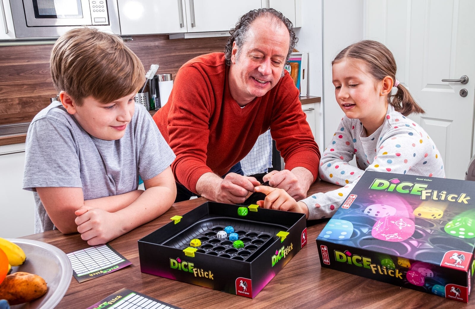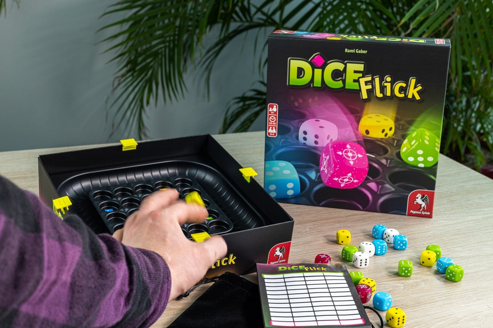 Dice Flick è una vittoria a metà strada in Dice Flick: nel gioco da 2 a 4 giocatori competono per ottenere il maggior numero di punti in dieci round. Per fare ciò, ogni turno estraggono dadi da un sacchetto e ne lanciano due sull'area di gioco, che è montata all'interno della scatola del gioco. È possibile totalizzare tre dadi adiacenti dello stesso colore e rimetterli nel sacchetto. I dadi che cadono al centro del tabellone garantiscono il doppio dei punti e possono anche essere segnati da soli. Mentre i dadi bianchi fungono da jolly, i dadi rosa scintillanti attivano un punteggio speciale. I giocatori che sfruttano al meglio le abilità dei dadi e hanno una buona mira sono destinati a vincere la partita.