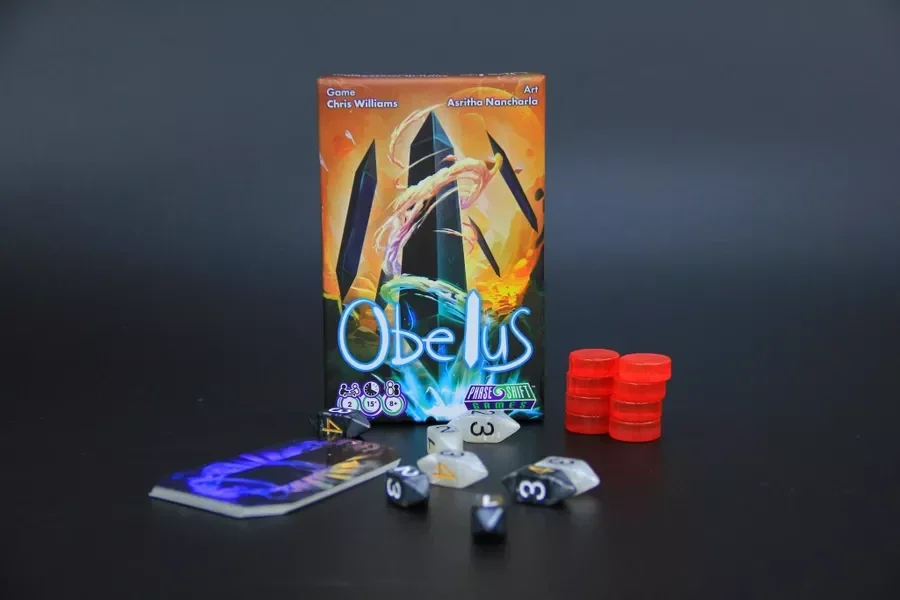 Obelus è un gioco di strategia astratto leggero per 2 giocatori, giocabile in 10-15 minuti. Assumendo il ruolo di un potente Mensor, evocherai dadi a forma di obelisco su carte conflusso, sposterai i tuoi obelischi in base al numero mostrato e bandirai gli obelischi del tuo avversario. Attraverso astute manovre, gli obelischi banditi possono essere riformati, creando una spaccatura che impedisce ulteriori evocazioni in quel punto di confluenza. Vinci quando il tuo avversario non può evocare o spostare legalmente un obelisco!