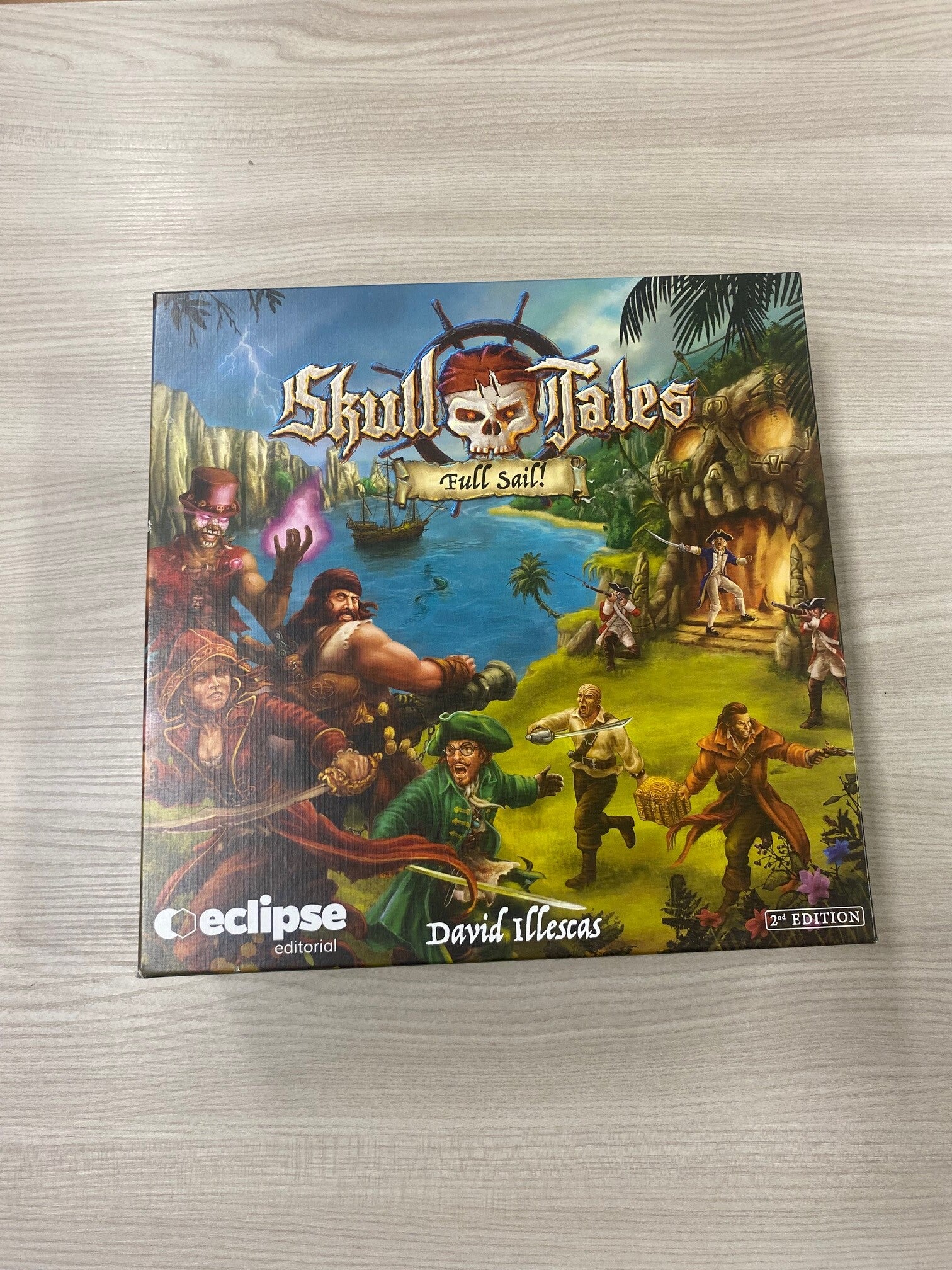 Skull Tales - Full Sail! è un gioco di avventura pirata semi-cooperativo da 1 a 5 giocatori. In Skull Tales, sei un pirata del Mar dei Caraibi in cerca di fama e fortuna. Il gioco si svolge in tre fasi: Avventura, Viaggio e Porto. Queste fasi sono giochi in sé e per sé con meccanismi e componenti propri. Ci sono anche molti elementi RPG. Durante la fase Avventura, esplori isole misteriose, grotte pericolose, templi abbandonati e saccheggi ville coloniali. Ti imbatterai in infidi giubbotti rossi e i loro ufficiali e incrocerai le spade con gli scheletri dei conquistadores, il tutto mentre cerchi di sfuggire alle maledizioni delle mummie Maya. E non dimenticare il potente artiglio scuro e le sue abominazioni governate da Yemaya, la dea del mare. Tesori incredibili e manufatti leggendari su cui nessun uomo ha mai posato gli occhi ti aspettano nella fase di gioco. Nella fase di viaggio, fai parte dell'equipaggio di "The Southern Lady" che naviga nei minacciosi mari dei Caraibi alla ricerca di tesori preziosi. Salirai a bordo di navi e affronterai ogni tipo di pericolo come le creature più temute dei sette mari. Assicurati di conquistare la fiducia dei tuoi compagni di equipaggio in modo che quando arriva il momento dell'ammutinamento, puoi assumere il capitano e beneficiare dei suoi numerosi privilegi... Infine, hai la possibilità di riposarti e spendere il tuo bottino durante la fase porto. Al tuo arrivo a Tortuga, potrai visitare la cantina, ascoltare le voci e raccontare grandi storie sulle tue imprese che ti trasformeranno in un leggendario pirata. Puoi anche visitare Madame Claude's Mansion ed essere trattato come un nobile. Forse, però, preferisci andare al mercato per comprare quella spada che ti tornerà utile per la tua prossima avventura. E, naturalmente, se scendi al molo puoi assumere alcuni incarichi per il Capitano che è sempre disposto a guadagnare qualche doblone in più vendendo contrabbando. Per quelle anime inquiete in cerca di una cura per qualche maledizione o ferita, c'è la Cappella. Ma attenzione! Le strade di Tortuga possono essere pericolose e non sai mai quali sorprese potrebbero riservarti. E ricorda, è meglio essere puntuali quando è ora di imbarcarsi o perderai prestigio!