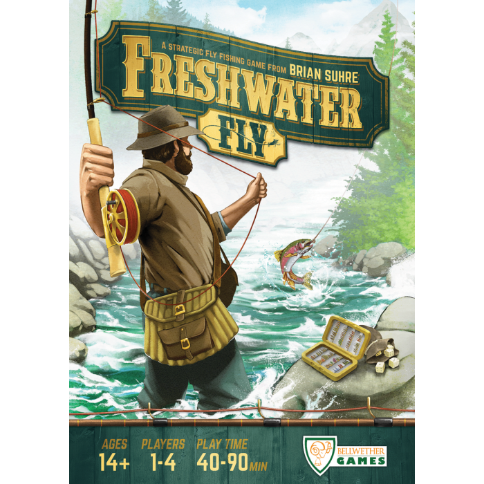 In Freshwater Fly ti ritroverai in un torrente di montagna impetuoso impegnato nella cattura di pesci, armato esclusivamente di canna, mulinello e una selezione di mosche. Per catturare pesci e guadagnare preziosi punti obiettivo, dovrai eseguire con attenzione una serie di manovre tattiche mentre esegui una strategia deliberata e in evoluzione. Inizia esaminando la continua evoluzione nella corrente e lega una mosca per abbinare il tuo pesce bersaglio al momento giusto lungo il fiume. Quindi scegli di lanciare a monte per andare alla deriva con la corrente e ottenere morsi extra sulla tua lenza, oppure sfida la fortuna con un lancio mirato per la cattura perfetta. In entrambi i casi, è saggio lanciare vicino alle rocce per aumentare le tue abilità e scoprire nuove tecniche di pesca, mantenendo la tua scorta di finezza carica per la prossima sfida. La tua bobina a rondella, che gira fisicamente, ti fornisce bonus diversi man mano che tracci la tua lenza, a seconda di quanto aggressivamente scegli di combattere il pesce che hai catturato. Applicare la resistenza, ad esempio, annullerà la forza del pesce, ma sfruttare il tuo slancio potrebbe fornirti un'azione unica per prepararti perfettamente per il tuo prossimo lancio. Al suo interno, Freshwater Fly è un gioco di raccolta di dadi e set, con elementi di risoluzione di enigmi creativi e di sfida alla fortuna. Ad ogni turno si seleziona un dado dalla riserva di dadi e gli si assegna un'azione relativa alla particolare manovra di pesca che si desidera effettuare. I dadi di valore più alto in genere ti fanno guadagnare azioni più potenti, ma accumulare totali di dadi inferiori può farti guadagnare turni gratuiti. I dadi che selezioni sbloccheranno o moltiplicheranno anche varie azioni bonus che puoi utilizzare per risolvere i più severi enigmi di pesca in modi unici e gratificanti. I set di pesci e mosche che raccogli ti aiuteranno a raggiungere obiettivi personali e comuni, ma per ottenere la vittoria devi concentrarti su quegli obiettivi che si sovrappongono nei modi più preziosi, senza rimanere indietro nel conteggio totale dei pesci. Il gioco termina quando un singolo giocatore cattura un settimo pesce, vengono assegnati punti obiettivo e viene dichiarato il vincitore.