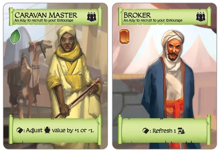 Durante il tuo turno, esegui azioni come giocare carte, assegnare incarichi ai mercanti, avviare una carovana e negoziare con i tuoi avversari.