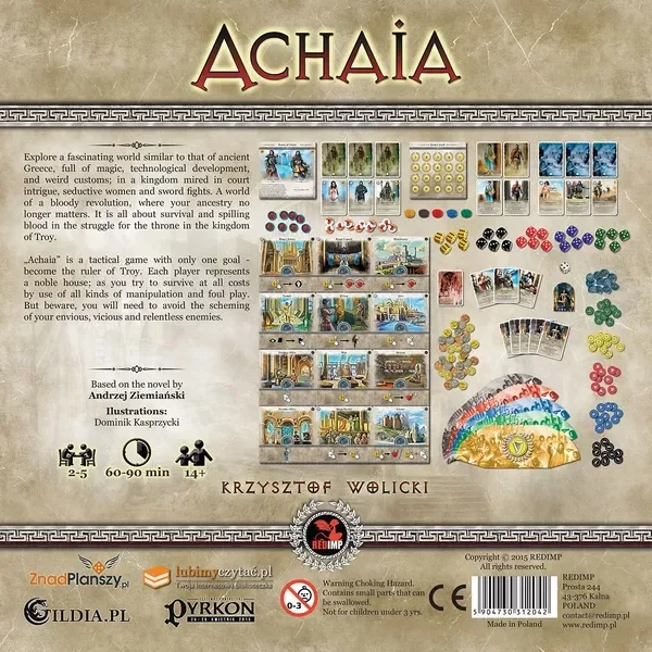 Achaia è un gioco tattico con un solo obiettivo: diventare il sovrano di Troia. Ogni giocatore rappresenta una casata nobile e si cerca di sopravvivere a tutti i costi ricorrendo a ogni tipo di manipolazione e gioco illecito. Ma attenzione, dovrai evitare gli intrighi dei tuoi nemici invidiosi, feroci e implacabili...