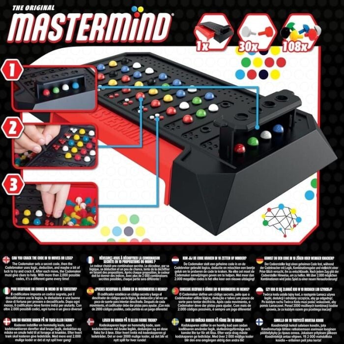 Mastermind - The Original Classic è il ritorno di un gioco da tavolo che ha segnato generazioni. Questa moderna riedizione del classico 2 giocatori ti invita a sfidare la tua famiglia o il tuo gruppo di amici in avvincenti partite di logica e strategia. Sarai tu il Mastermind del gruppo? Con il suo design accattivante e le sue regole semplici, Mastermind è un gioco che non passa mai di moda, capace di riunire persone di tutte le età intorno al tavolo. In Mastermind, il tuo obiettivo è decifrare il codice segreto del tuo avversario nel minor tempo possibile. Ogni giocatore sceglie una combinazione di colori e posizioni per i propri pioli, mentre l'altro cerca di indovinare correttamente. Il gioco include una plancia con un compartimento per i pioli, 108 pioli in 6 colori diversi e 30 pioli chiave rossi e bianchi. La sfida consiste nel dare solo le informazioni necessarie e cercare di confondere l'avversario per ottenere un risultato finale migliore.