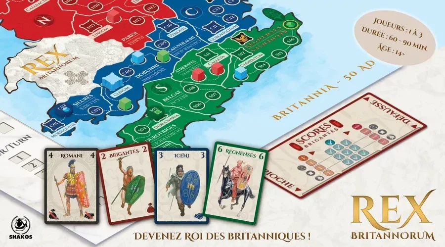 Rex Britannorum è un gioco di strategia che può essere giocato in solitaria, con 2 o 3 giocatori. La vittoria si ottiene occupando strade e città nelle diverse regioni della Britannia mostrate sul tabellone di gioco. Inoltre, ogni giocatore avrà due obiettivi personali da completare, che gli faranno guadagnare punti vittoria aggiuntivi.