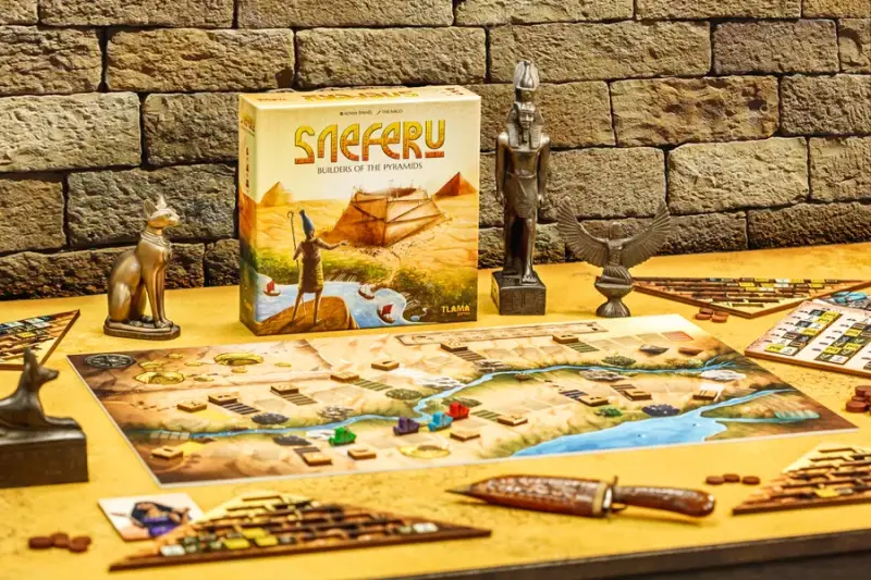 Sneferu è un gioco astratto per famiglie di Adam Španěl (Project L) in cui i giocatori tentano di conquistare il favore del grande faraone costruendo la piramide più alta possibile con blocchi estratti (con ogni blocco che è una combinazione di due dei cinque possibili materiali). I giocatori ottengono questi blocchi spendendo le due risorse del gioco: cibo e tempo. Il tempo, rappresentato dalla tua barca che avanza sul Nilo, è una risorsa finita e non c'è modo di guadagnarne di più. La posizione delle barche sul fiume determina anche l'ordine dei giocatori: è sempre il turno del giocatore che ha utilizzato meno tempo ed è il più indietro sul Nilo. I giocatori possono guadagnare cibo completando sezioni delle loro piramidi con materiali corrispondenti.
