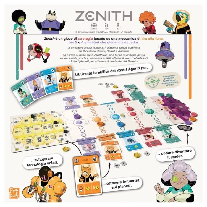 Zenith è pensato come uno scontro 1 vs 1 ma appunto con una modalità a squadre 2 vs 2 dove i giocatori lotteranno per ottenere influenza su 5 pianeti. Questa influenza è rappresentata da dischetti di diverso colore.