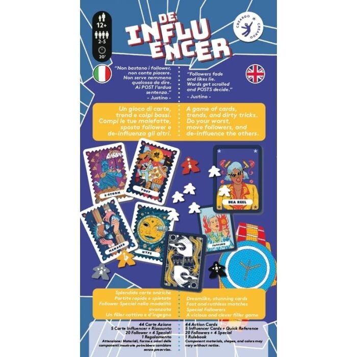 De Influencer è un gioco di carte competitivo e satirico che porta i giocatori nel mondo frenetico dei social, dove i follower sono la vera moneta e ogni trend può decretare il successo o il fallimento. Per diventare la prossima star virale dovrai manipolare i trend, conquistare follower e mettere i bastoni tra le ruote agli avversari con colpi bassi e mosse imprevedibili.