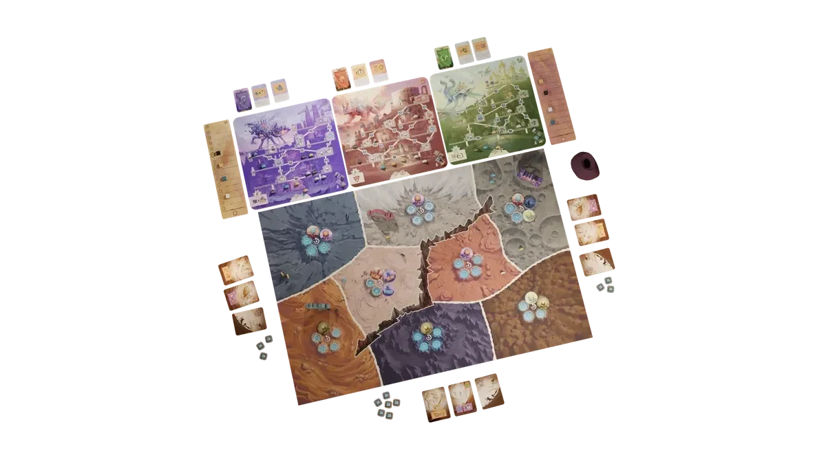 During the game, players hang-glide between the dynamic map and the modular Colossi boards, racing to collect precious eggs, hatch newborns, and outmaneuver their rivals. Your units are your most vital resource as every placement and movement matters. Send your envoys up into the cities to gain benefits and influence for your tribe, or glide them down into the wastes below to compete for eggs that the Colossi lay on their wanderings. As the map fills with eggs, the tension rises. Newborns hatch, and players clash in clever contests of positioning and card play with no destruction and no direct attacks — only smart, tactical maneuvers to claim victory.