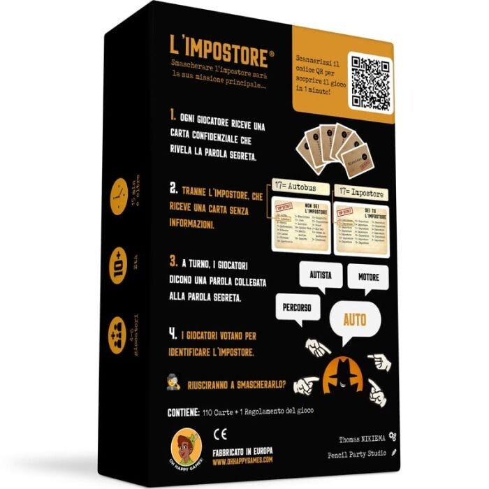 L’Impostore è un party game di parole e deduzione sociale che mescola bluff, intuizione e divertimento. Ogni giocatore conosce la parola segreta, tranne uno: l’Impostore.