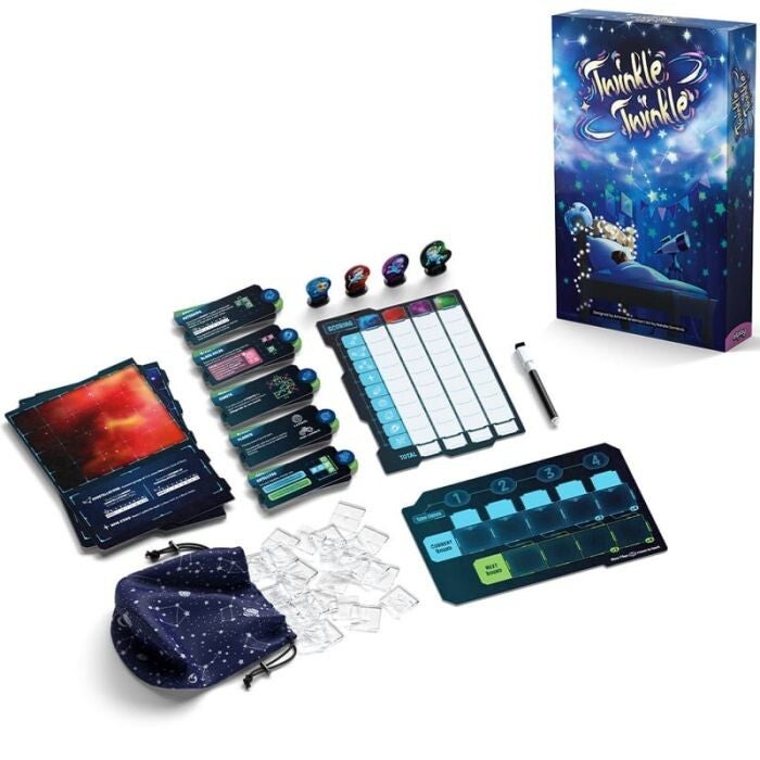 Twinkle Twinkle è un brillante puzzle spaziale in cui ogni tessera trasparente contribuisce a costruire una mappa stellare unica e affascinante. Collega costellazioni, forma cinture di asteroidi e sfrutta le insidiose attrazioni dei buchi neri per massimizzare il punteggio. Con un ordine di turno variabile e un sistema di punteggio modulare, ogni partita offre nuove sfide e infinite possibilità. Un viaggio galattico perfetto per chi ama i puzzle eleganti e le componenti da toccare e ammirare.
