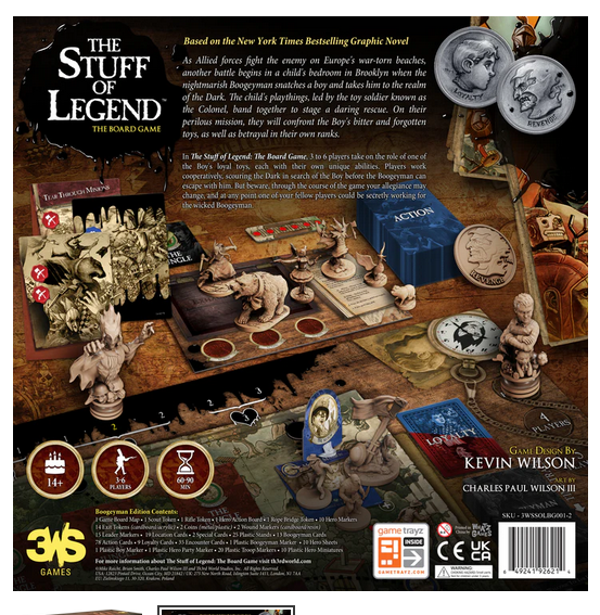 Copertina protettiva, miniature dei personaggi, gettoni di uscita in resina, moneta in metallo Boogeyman, il primo numero del fumetto The Stuff Of Legend e un sistema di archiviazione GameTrayz personalizzato "Toy Chest".