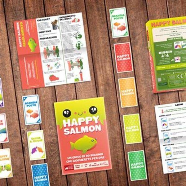 Happy Salmon è un gioco di carte velocissimo che fa muovere e ridere tutti in meno di due minuti. Quindi fate un po’ di spazio, liberatevi delle sedie e, se il vostro battito supera i 120 bpm, probabilmente state giocando nel modo giusto.