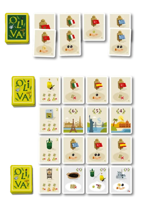 Oliva illustra sia i metodi di produzione tradizionali che quelli moderni, evidenziando la produttività dei piccoli uliveti che ancora oggi si possono ammirare sulle colline portoghesi. Il gioco riflette la portata e la qualità della produzione di olio d'oliva del Mediterraneo, con la Spagna che si avvicina ai livelli di produzione dell'Italia, seguita da vicino da Grecia e Turchia.