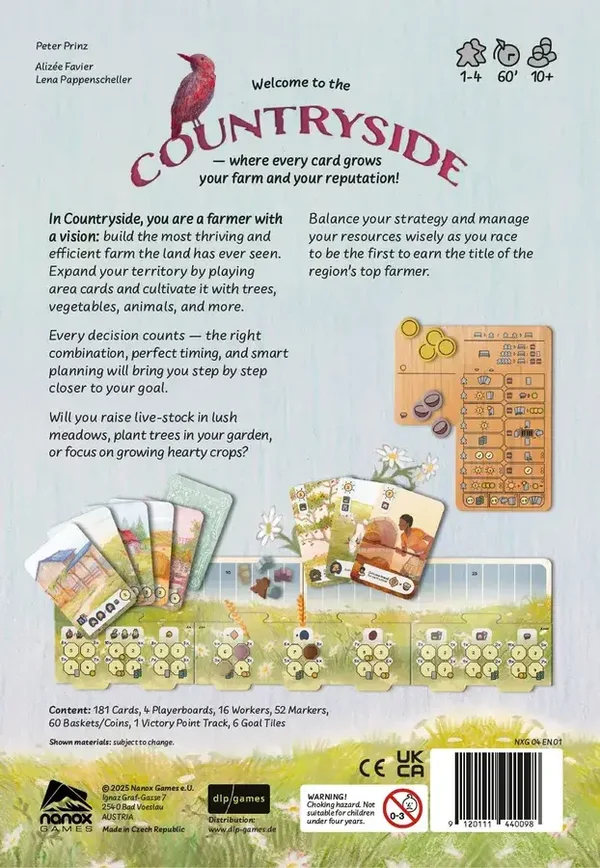 In Countryside, sei un agricoltore con una visione e vuoi costruire la fattoria più fiorente ed efficiente che la terra abbia mai visto. Per farlo, espanderai il tuo territorio giocando a carte ad area e coltivandolo con alberi, verdure, animali e altro ancora. Allevi il bestiame in prati lussureggianti, pianterai alberi nel tuo giardino o ti concentrerai sulla coltivazione di colture sostanziose? Ogni decisione conta come la giusta combinazione di elementi, il tempismo perfetto e la pianificazione intelligente ti porteranno passo dopo passo più vicino al tuo obiettivo.