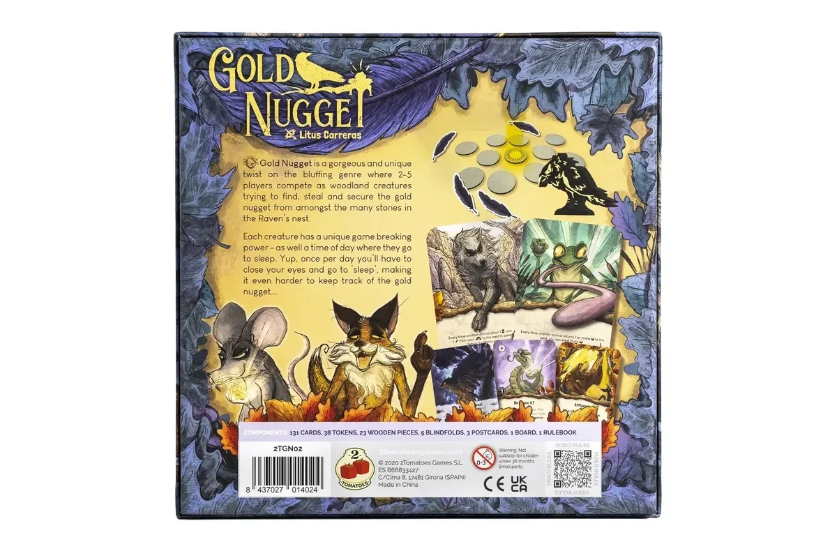 Gold Nugget è una splendida e unica variante del genere bluff, in cui da 2 a 5 giocatori si sfidano nei panni di creature del bosco, cercando di trovare, rubare e mettere al sicuro la pepita d'oro tra le numerose pietre nel nido del corvo.