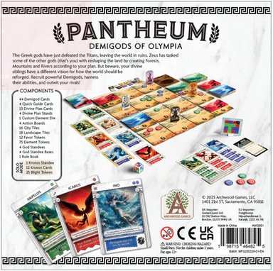In Pantheum – Demigods of Olympia i giocatori impersonano divinità incaricate di plasmare un mondo in rovina dopo la caduta dei Titani. Ogni turno permette di modellare la mappa aggiungendo e spostando elementi destinati a trasformarsi in Foreste, Montagne e Fiumi, mentre si reclutano Semidei come Perseus, Odisseo e Icaro, ognuno dotato di abilità ispirate ai miti. Quando il mondo viene completato, la divinità che meglio realizza il proprio Piano Divino e forma la squadra più potente conquista la vittoria.