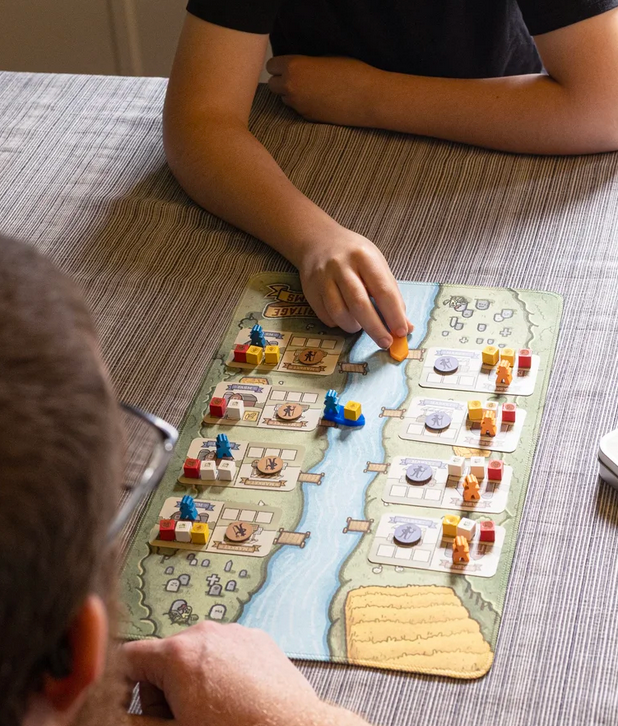 Questo è un gioco basato sul classico indovinello del contadino che deve far attraversare il fiume con il suo Pollo, la Volpe e il Mais, dato che sulla barca c'è spazio solo per uno alla volta. Se lasci soli il Pollo e la Volpe, il Pollo verrà mangiato. Se lasci soli il Pollo con il Mais, il Mais verrà mangiato. La novità di questo gioco è che puoi lasciare l'altro giocatore a sorvegliare le tue risorse insieme alle sue. I giocatori competono per essere il primo a far attraversare il fiume con 2 set di Pollo, Volpe e Mais!