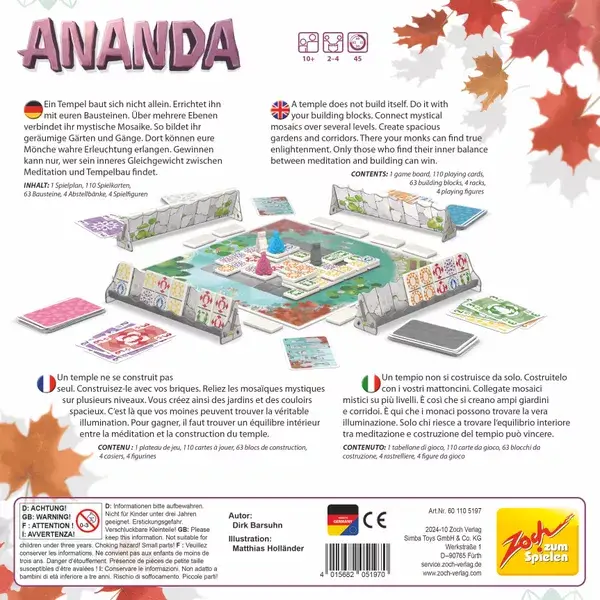 Ad Ananda, i giocatori costruiscono un tempio con tessere in stile domino e lasciano che i loro monaci meditino lì. Più grande è l'area colorata costruita, più punti karma il giocatore può raccogliere. Più specificamente, all'inizio del proprio turno, un giocatore deve spostare il proprio monaco in una nuova area colorata sul tabellone di gioco. Quindi gioca quante tessere desidera dalla sua mano, purché almeno una delle tessere sia adiacente al suo monaco, tutte le tessere piazzate espandono l'area colorata e ogni tessera copre esattamente due tessere che sono sullo stesso livello. (Le tessere non devono essere sullo stesso livello per far parte della stessa area colorata.)