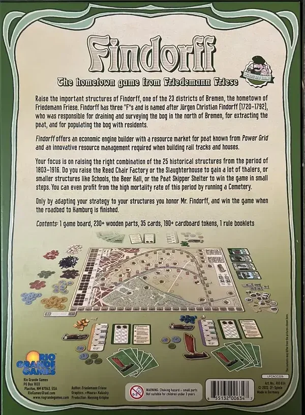 Findorff offre un costruttore di motori economici con un mercato delle risorse per la torba noto come Power Grid e un'innovativa gestione delle risorse necessaria per la costruzione di binari ferroviari e case. Il tuo obiettivo è costruire la giusta combinazione delle 25 strutture storiche del periodo 1803-1916. Costruisci la Fabbrica di Sedie di Canna o il Mattatoio per guadagnare molti talleri, o strutture più piccole come le Scuole, la Birreria o il Rifugio per il Pescatore di Torba per vincere la partita a piccoli passi.