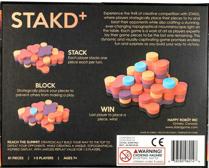 Stakd è un gioco di impilamento strategico che si gioca in round. A ogni round, i giocatori impilano le pedine per costruire il gioco (o bloccare gli avversari) finché non è più possibile aggiungerne altre. L'ultimo giocatore a posizionare una tessera vince il round. Il primo giocatore a vincere 3 round vince la partita. Ma attenzione! Sei fuori dal round se non riesci a posizionare una tessera!