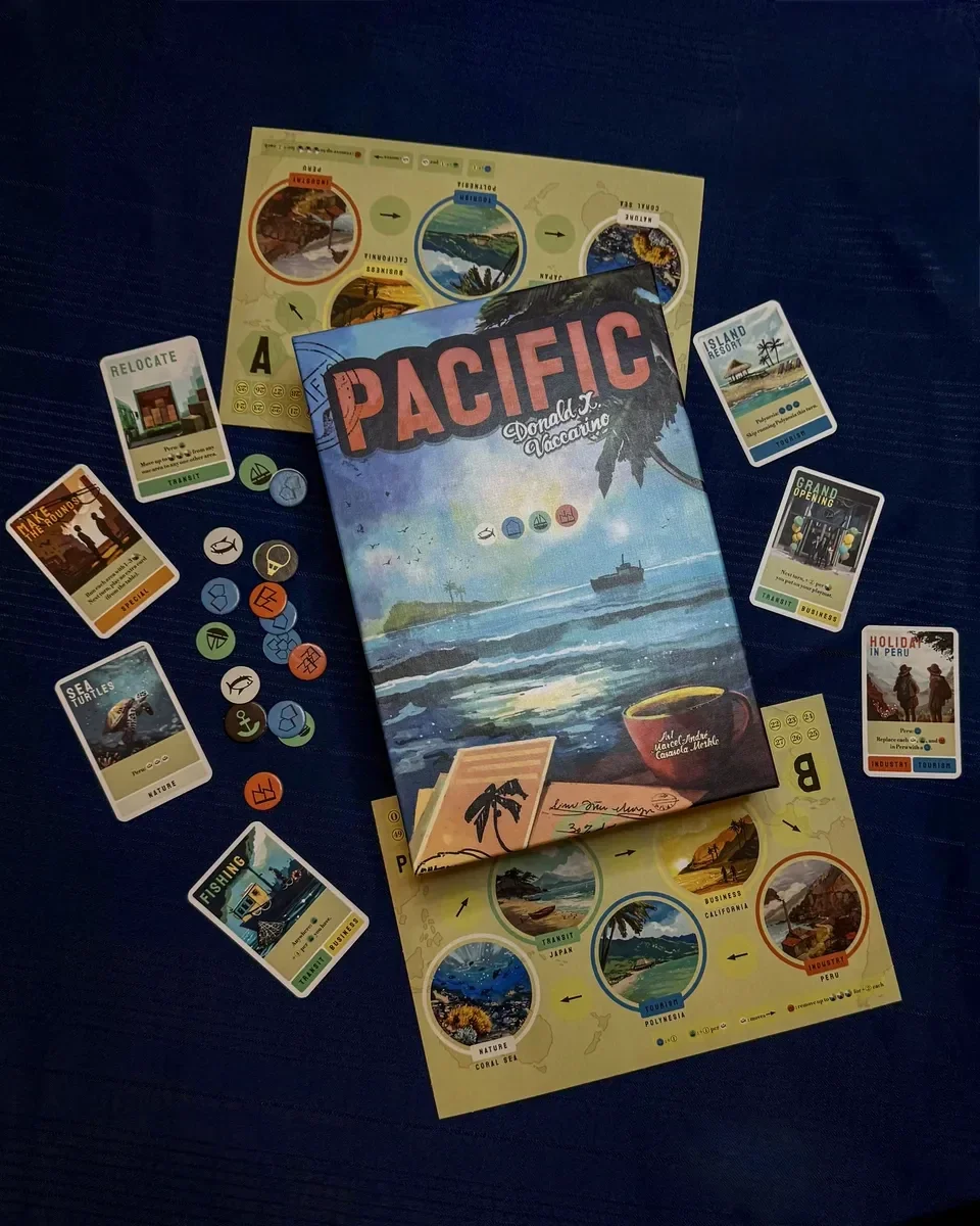 Il tuo obiettivo in Pacifico è guadagnare più soldi di chiunque altro, che sia pescando, gestendo alberghi, lavorando in fabbrica o commerciando. Il gioco dura dieci round e, all'inizio di ogni round, ogni giocatore rivela una carta dalla propria mano contemporaneamente. Poi, tutti i giocatori rivelano quale delle carte rivelate vogliono usare, quindi usano simultaneamente la carta scelta.