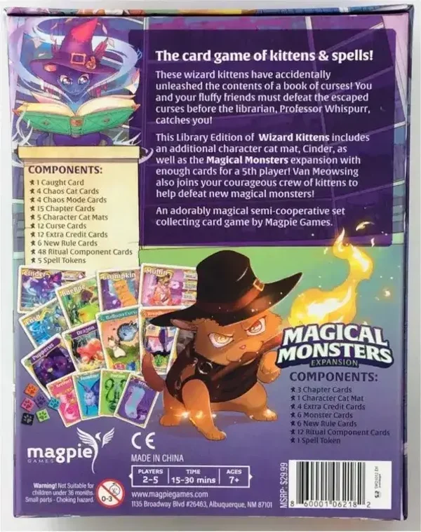 Questa Library Edition di Wizard Kittens include un tappetino aggiuntivo per gatti, Cinder, e l'espansione Mostri Magici con carte sufficienti per un quinto giocatore! Anche Van Meowsing si unisce alla tua coraggiosa squadra di gattini per aiutarti a sconfiggere nuovi mostri magici!