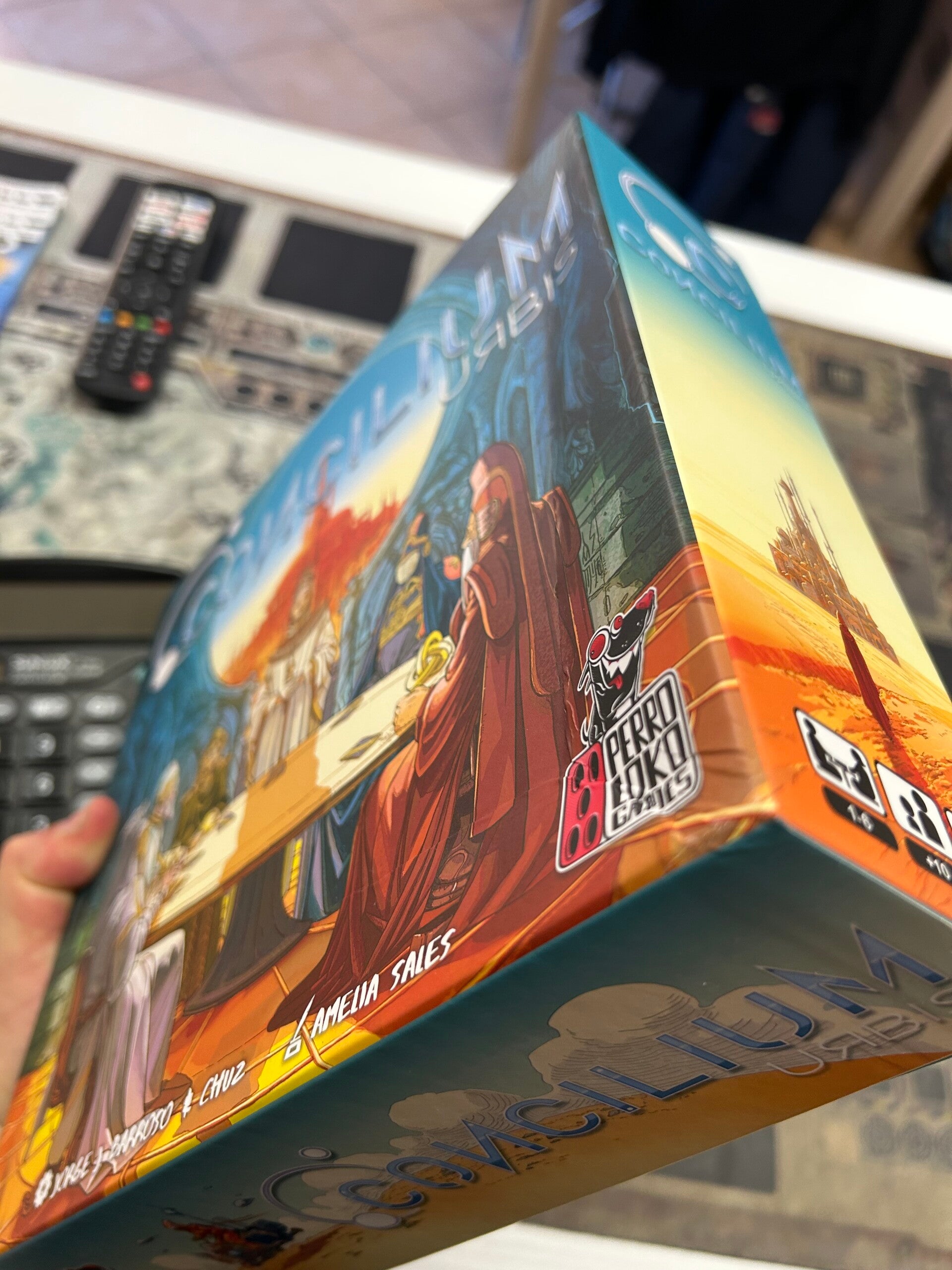 Concilium è un gioco di costruzione di città in cui ci sono carte punteggio chiamate carte Legge. Tutte le tessere nella tua città otterranno punti alla fine del gioco come mostrato dalle carte legge. Durante il gioco puoi cambiare questo punteggio usando la procedura di voto.