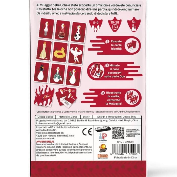 Gossip Goose è un party game di deduzione e mimica in cui i giocatori, nei panni di buffe oche detective, devono ricostruire un misterioso omicidio… senza poter pronunciare una sola parola. Nel Villaggio delle Oche è stato commesso un crimine e tocca ai giocatori indagare sugli indizi. Pescando le carte Identità, ognuno avrà un ruolo segreto: alcuni collaboreranno per ricostruire la verità, mentre una malvagia oca cercherà di depistare tutti con mosse ingannevoli e sospette. Le carte Oca guidano la mimica del caso, trasformando ogni turno in una scena esilarante fatta di gesti, interpretazioni e deduzioni improvvise. Tra accuse, fraintendimenti e colpi di scena, solo osservazione e intuito permetteranno di smascherare la colpevole e risolvere il mistero.