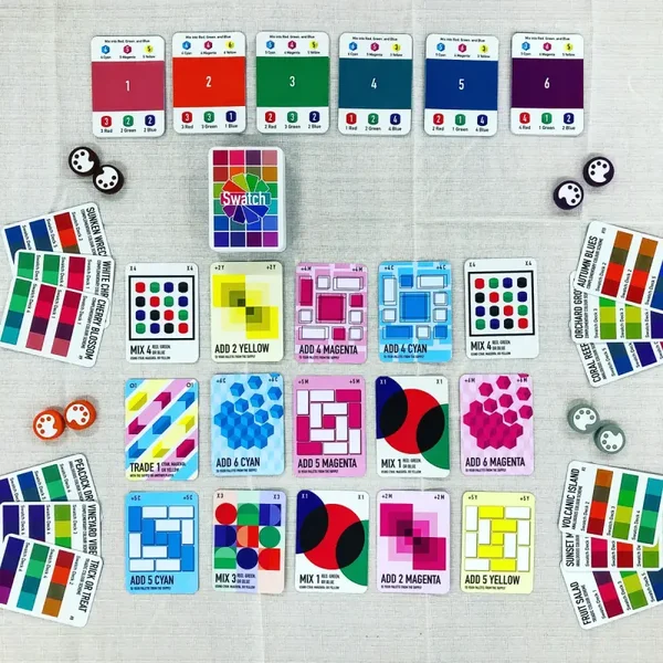 Scegli e mescola i colori per creare combinazioni cromatiche uniche in Swatch: The Abstract Game of Art. Pesca carte per aggiungere colori alla tua tavolozza, scambia con altri giocatori e mescola i colori per creare campioni e costruire la tua combinazione cromatica. Trova il giusto equilibrio tra velocità ed efficienza per essere il primo a finire, ma fai attenzione alla vernice che si rovescia!